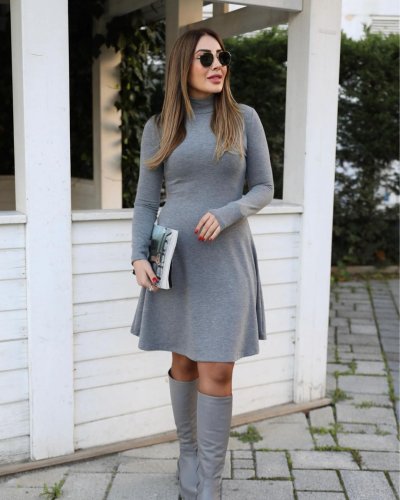 Kadın uzun kollu balıkçı yaka salaş kusa akrilik elbise