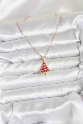 • 316L Çelik Zincir Gold Renk Kırmızı Çam Ağacı Model Yılbaşı Temalı Kadın Kolye