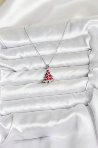 • 316L Çelik Zincir Gümüş Renk Kırmızı Çam Ağacı Model Yılbaşı Temalı Kadın Kolye